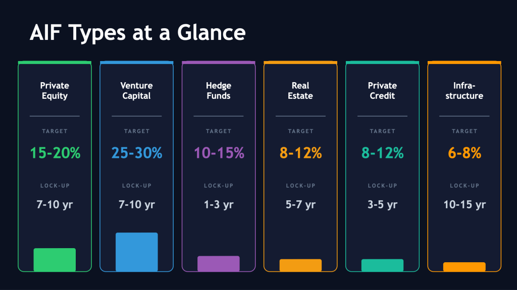 Each category has distinct characteristics affecting suitability for your situation. Private equity and venture capital require the longest lock-ups (7-10 years) and highest minimums (250,000 to 1,000,000 dollars minimum). Real estate requires moderate minimums (50,000 to 250,000 dollars) with moderate lock-ups (5-7 years). Infrastructure requires moderate minimums with longest lock-ups (10-15 years) but most stable returns. Private credit requires moderate minimums with shorter lock-ups (3-5 years).
